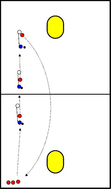 - Speler 1 start met een breedtelijn en zet vervolgens strak aan voor de doorloopbal.