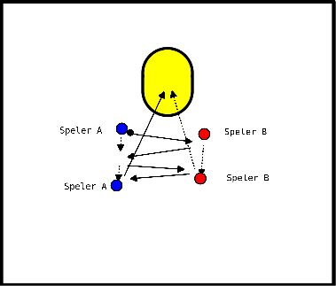 - Speler B gooit de bal aan naar speler A.