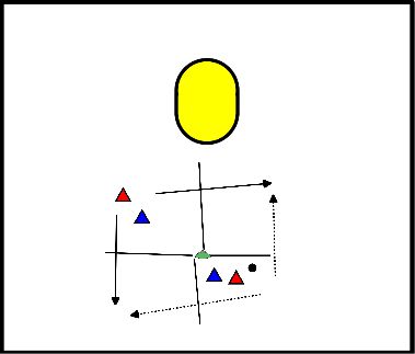 - De aanvaller met verdediger bevindt zich tussen twee mede-aanvallers.