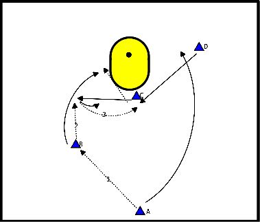 - Speler B gooit de bal naar speler C en gaat op de plek van speler C staan.