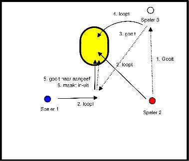 - Bal wordt vanuit de voorzijde van de paal gegooid naar de wegtrekkende speler, daarna schot.
