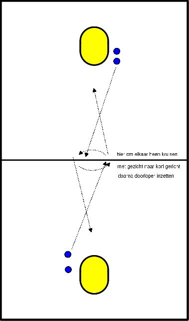 Je kunt met deze oefening ook de nadruk leggen op de doorloopbal met de opdracht, scoor 20 doorloopballen over rechts en 20 over links