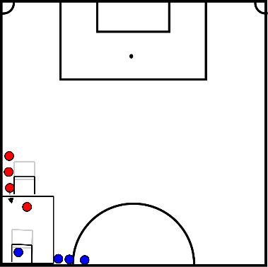 - Indien verdediger bal kan afpakken probeert hij te scoren in het doel aan de zijkant.
