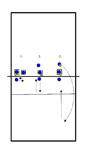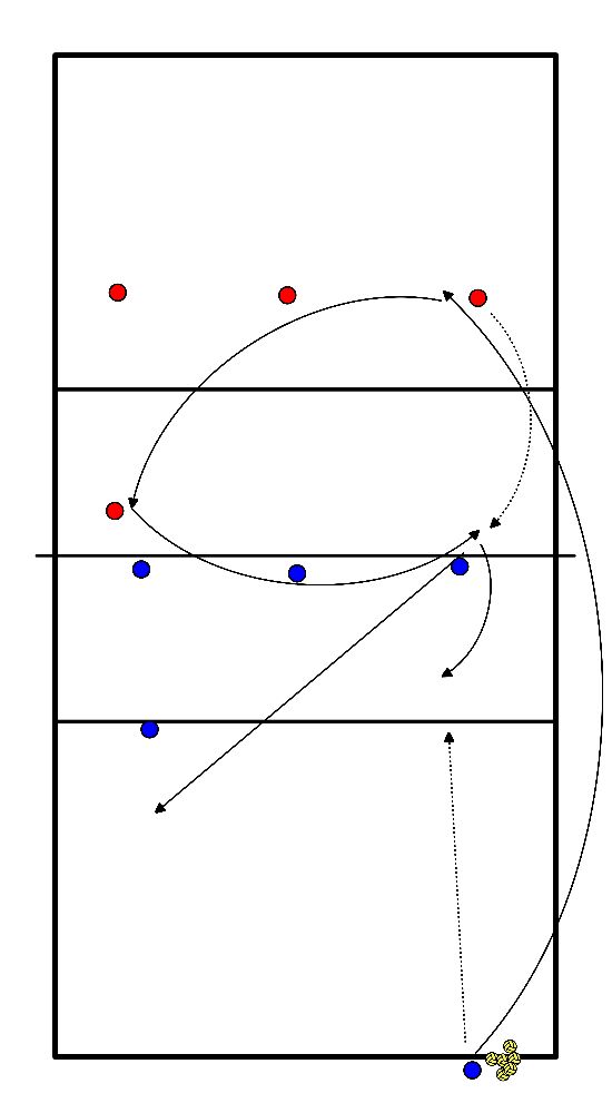 - Doordraaien: passer wordt aanvaller -> aanvaller wordt reserveverdediger -> verdediger wordt reserve-aangooier -> aangooier wordt reservepasser.