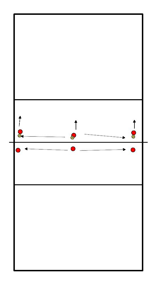 - Spelers staan in de hoeken van een speelhelft. Spelers bij het net gooien rechtdoor, spelers in het achterveld gooien diagonaal. Iedereen loopt achter zijn bal aan.