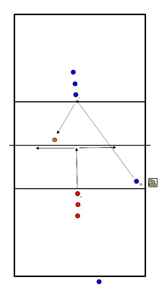 TR aan 1 kant van het veld + blokker en libero/SV en aanvallers aan de andere kant.