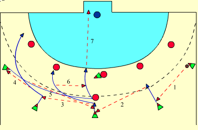 - LH começa ao longo da linha de lance livre, faz 3 passes primeiro, dribla se necessário e faz um passe para MO e pressiona MV