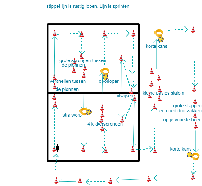 - Os jogadores correm para os 2 peões de trás, rodam à volta deles e correm para o cesto, sendo o primeiro a receber uma bola cruzada.