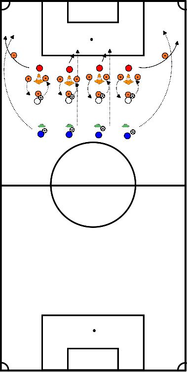 - Após o 1x1, o jogador azul recebe um novo passe do jogador na fila vermelha.