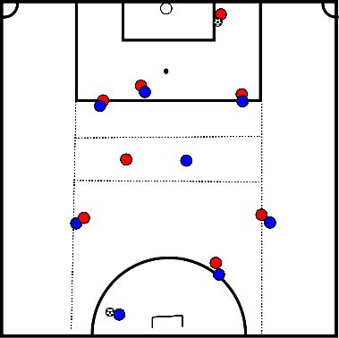 - Após a finalização, dois atacantes saem em velocidade para impedir que os laterais/alas marquem nas mini balizas.