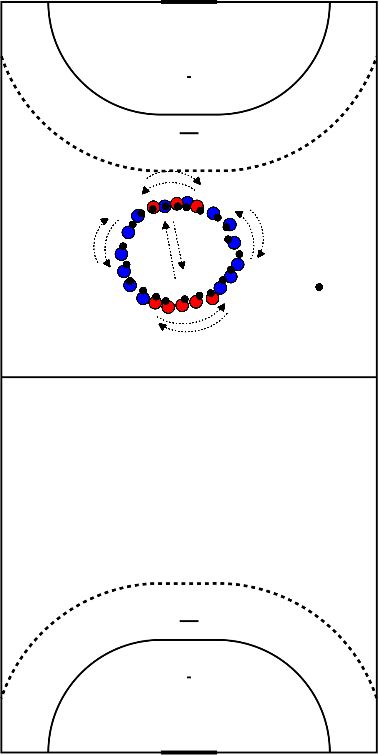 - 2º exercício = cada um rola a bola por baixo para o jogador seguinte, passando por cima / à volta para a direita
