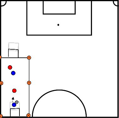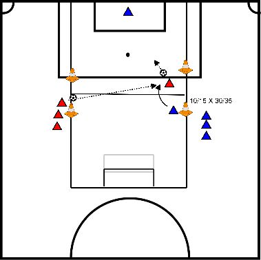 - o azul passa a bola na diagonal de volta para o vermelho, que nesta altura já correu para o cone no meio.