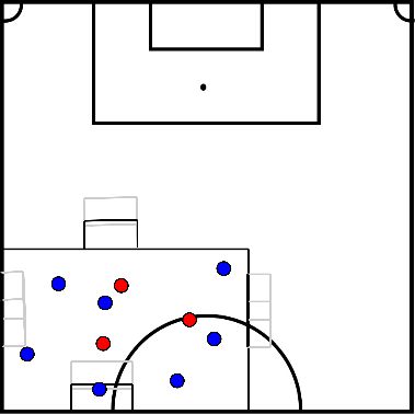 - O vermelho tenta marcar na baliza grande e o azul nas balizas pequenas.