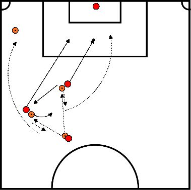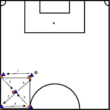 - O jogador 3 passa a bola para o jogador 2 e o jogador 2 joga na diagonal para o jogador 4 e assim por diante.