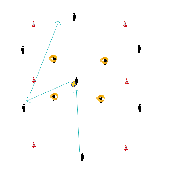 - O jogador 6 passa a bola ao jogador 1 e corre para o cone junto ao jogador 1