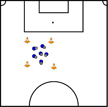 - Os jogadores posicionam-se em círculo. Idealmente, 6 a 8 jogadores por círculo. Em cada círculo há apenas uma bola.
