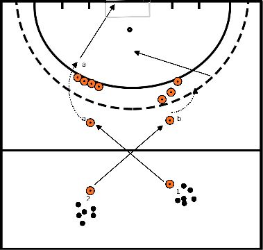- Os atacantes pegam a bola em algum lugar na linha tracejada e tentam marcar.