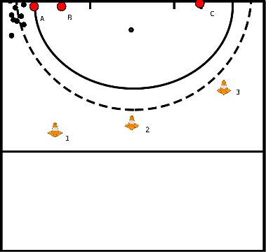- O jogador no ponto C recebe a bola, gira em direção ao gol e finaliza.