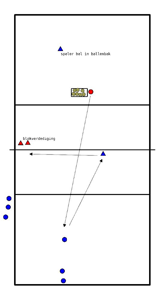 Do outro lado da rede, os outros jogadores estão alinhados - na imagem, são 2 jogadores - estes têm o carrinho da bola e jogam a bola para cima, apanham o ataque e defendem. O jogo continua!