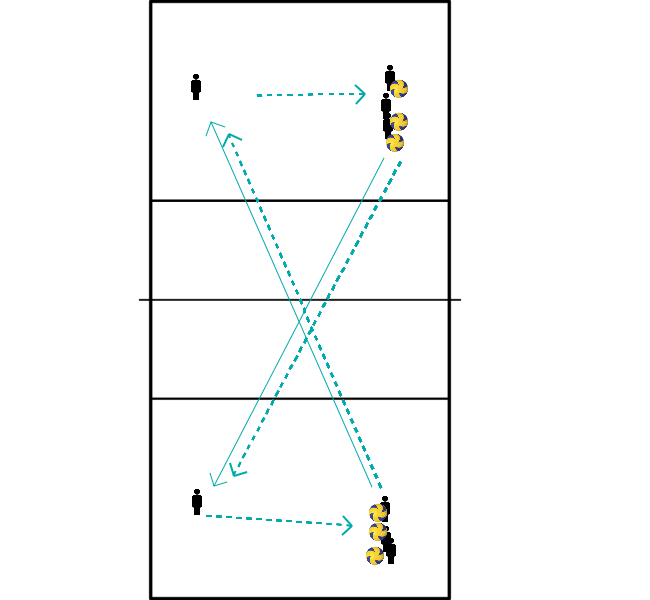 - De cada lado da rede, uma fila de jogadores coloca-se perto da linha de fundo.