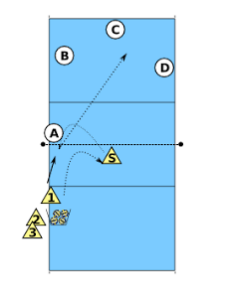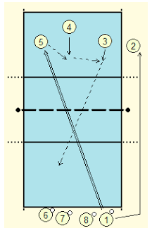 - O jogador 1 serve a bola (e depois corre diretamente para onde o jogador 2 já está).
