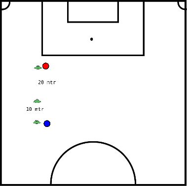 - Der blaue Spieler in der hinteren Reihe spielt den Ball diagonal zum roten Gegenspieler