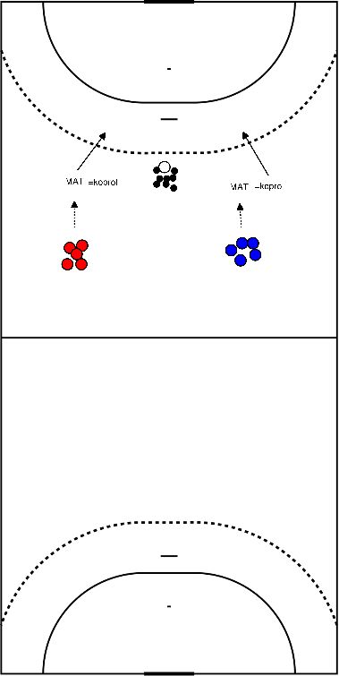 - Ein Spieler steht im Kreis und ein Spieler auf der 9-Meter-Linie.