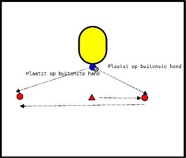 - Nun fängt er/sie den Ball mit der anderen Hand und spielt ihn zu Blau zurück. Dies macht er/sie bei allen sechs Hütchen.