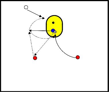 • Anschließend bewegt er sich in Verteidigungshaltung zum zweiten Hütchen und dreht dort vier Runden darum.
