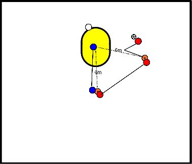 - Schnelle weite Bewegungen und Pass (1 Hand) auf 6 Meter. 3x passen und dann schießen.