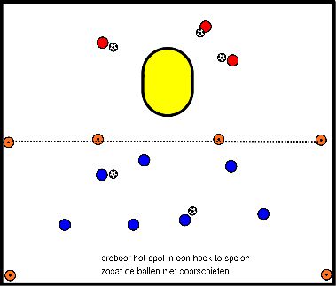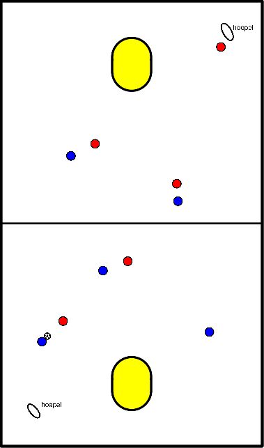 - Teil e: Wie b, aber mit einer Übernahmesituation. Der Läufer spielt den Ball zurück zum Zuspieler, der vom Pfosten weggestartet ist. Wer erzielt zuerst 5 Treffer?