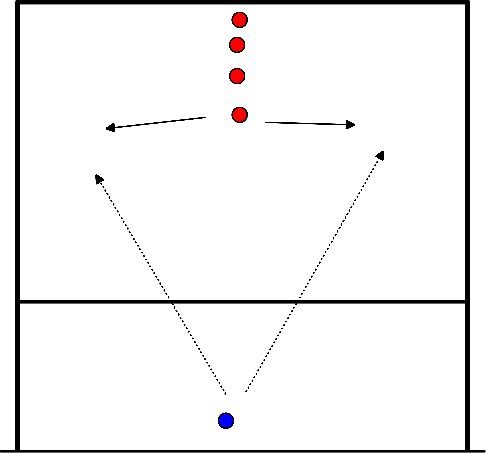 - Der Zuspieler gibt eine Vorlage an Spieler 1, 2 oder 3 für einen Angriff auf die drei Verteidiger.