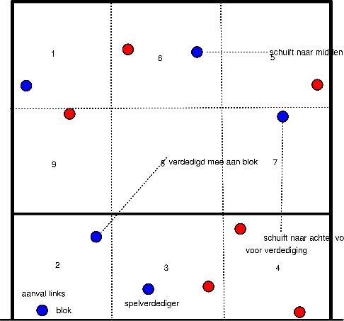 - Von Position 5 direkter Angriff aus der Mitte auf den Spieler; Mischen auf Position 6, Ball wird eingeworfen.