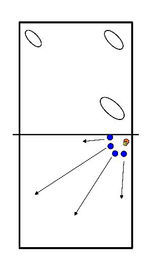 - 3 Verteidiger (+1 Warteraum) auf einer Seite des Spielfelds, der Rest auf der anderen Seite, alle mit Ball (Aufschläger) + Ball