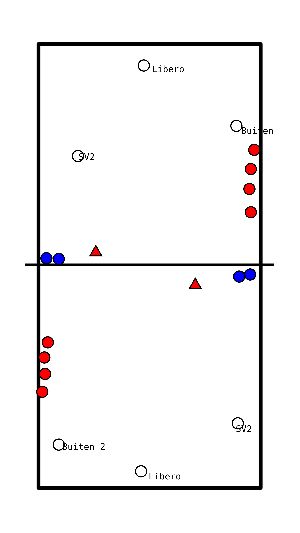 - Zuspieler tippt die Zuspielposition mit dem Fuß an (Reifen). Bei 3 gegen 3 läuft der Zuspieler ein.