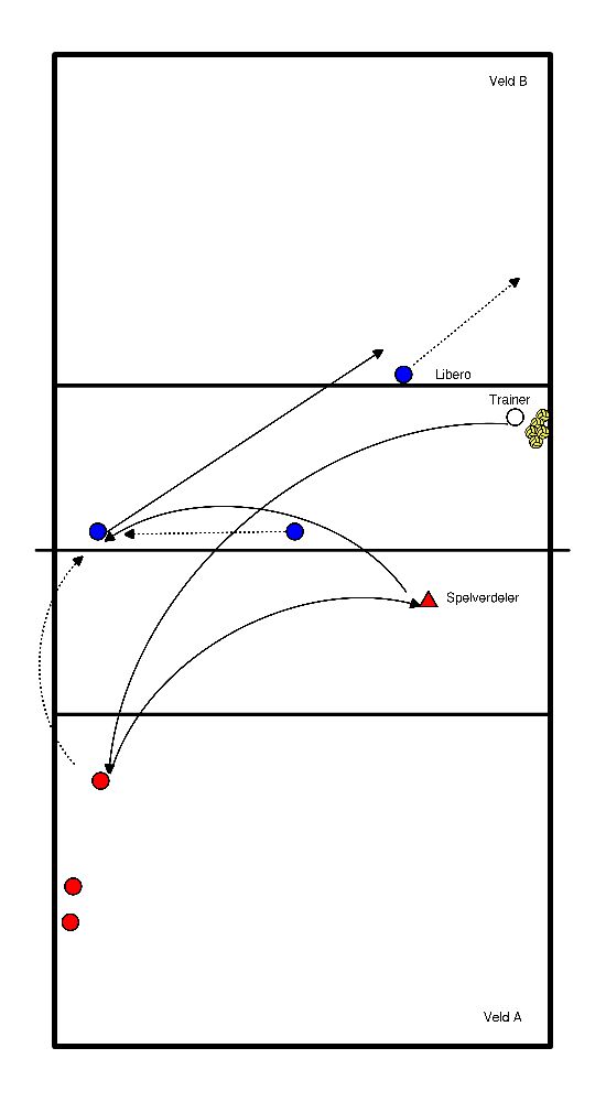 - T schlägt den Ball zum Libero, 2 Angreifer starten am Netz.