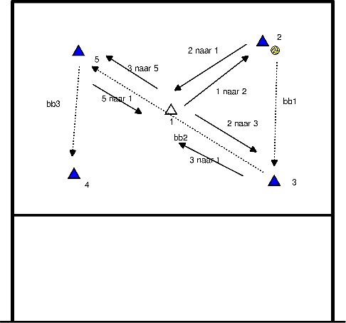 - Spieler 1 schmettert gegen Spieler 4, Spieler 2 gibt einen kurzen Ball, Spieler 3 schmettert.