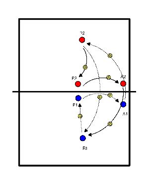 - R2 übergibt OH den Ball an P2 (kann sich auf eine Matte stellen, wo er/sie nicht absteigen darf) (geht in BH-Position)