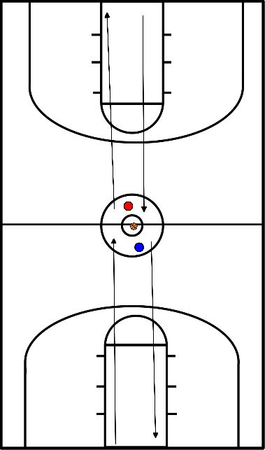 - Player 1 takes the rebound and makes an outlet pass to player 2 who runs through