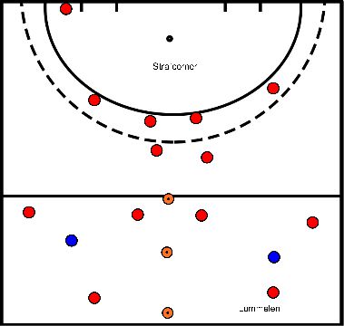 - Ball 2: A immediately turns around and receives the ball from C exactly along the pawns so that A can elevator the ball over the pawns and then rounds with the backhand on goal.