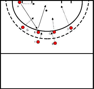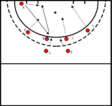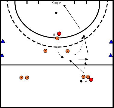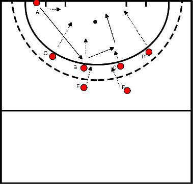 - A stands in the middle of the circle and gets start 4 balls to round off on goal.