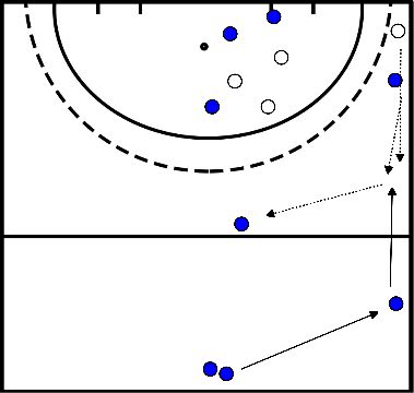 - Try with at least 3 or more players in the circle to outplay the goalkeeper during the attack. Do not aim for the ball to go straight to goal when you enter the circle but look for the right passing options.