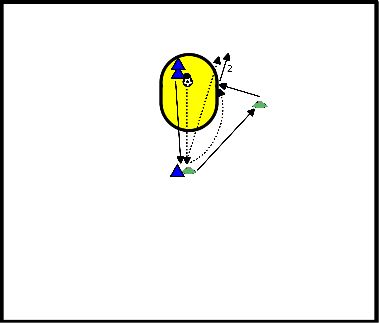 - Player 1 makes a fierce running line to the one hat, receives the ball on the outside hand and passes back.