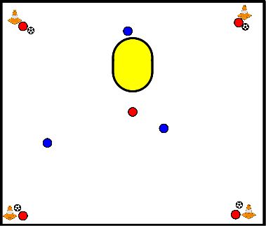 One 3 per pole. The exercises must be done at 100%. Each exercise lasts 2.5 minutes. The intermediate exercises take a specific time. The goal is to generate the most goals as a group.