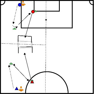 - The front player of the two at the cone has the ball and passes it directly to the feet of the player opposite her. Then, this player sprints to the other side and stands by the cone.