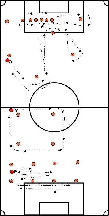 - The exercise is alternately performed on the blue and red side; red starts when the diagonal pass from blue is given.