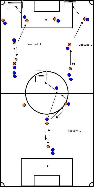 - The exercise is alternately performed on the blue and red side; red starts when the diagonal pass from blue is given.