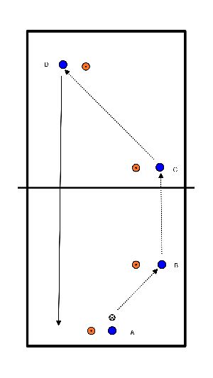 - Long pass straight through ground or air from player A Red to player B Blue.