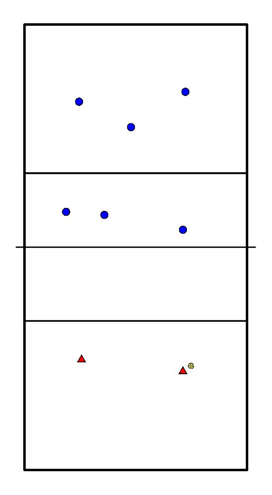 - Player C moves sight to the ball and dribbles to the net, makes a high dribble and keys to the attacking player.