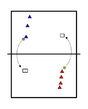 - The A players throw the ball to the B players, who defend the ball underhand and play it back to the A player in one contact.